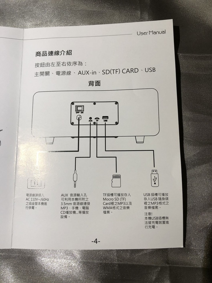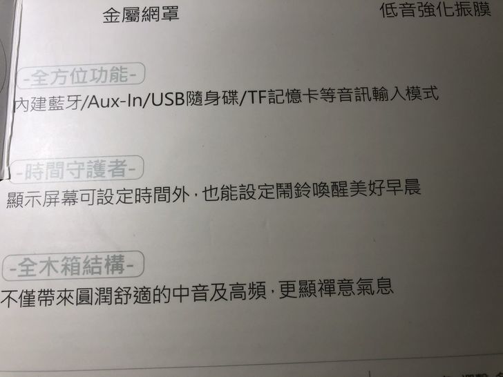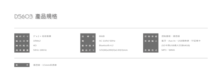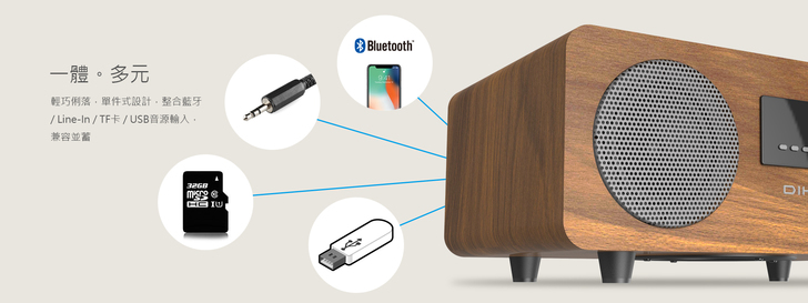 內建藍牙 / Aux-In / USB 隨身碟 / TF 記憶卡等音訊輸入