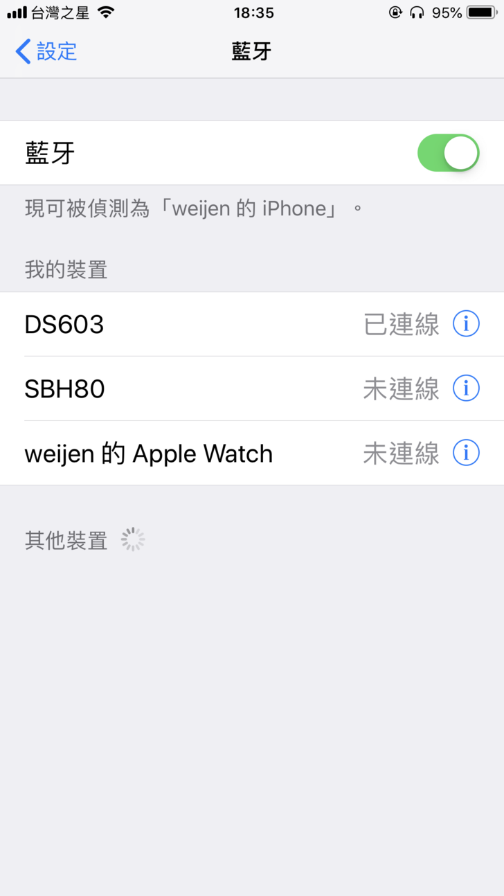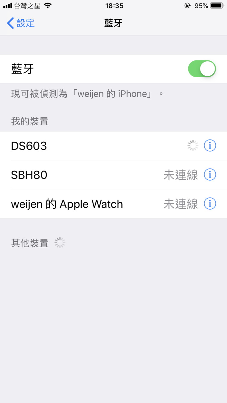 這邊是iPhone iOS系統的藍牙設定示意圖,打開藍牙即可快速搜索到DS603 相當快速便捷。
