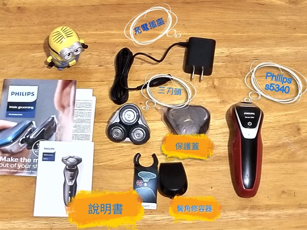 讓地球不會製造太多垃圾。有飛利浦Philips S5340電鬍刀本體、三刀頭、充電插座、保護蓋、鬢角修容器以及使用說明書。