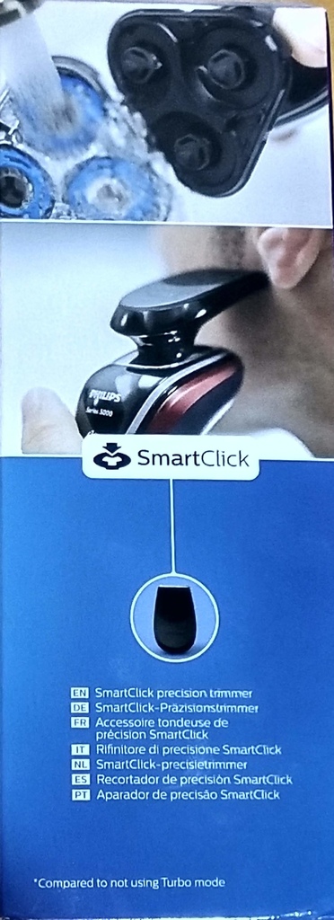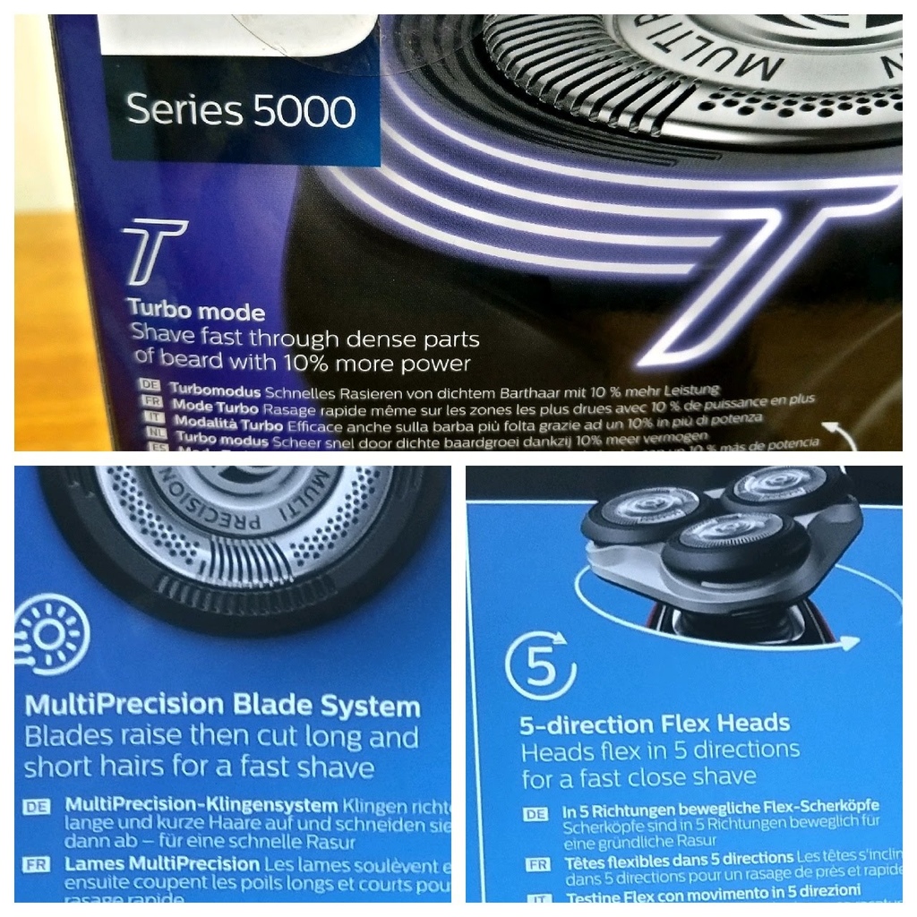 ▼盒裝正面印帥氣電鬚刀並以文字輔以圖簡單介紹重點讓你快速了解它的功能,嘿嘿嘿~背面有多國語言詳細介紹也少不了(可惜沒有中文…為看不懂哭哭,好在有圖片~),像是全機防水可水洗,啟動 Turbo 模式,獨特刀片設計,鬢角修容..等等功能,讓你可以快速了解Philips S5340電鬍刀的功能!