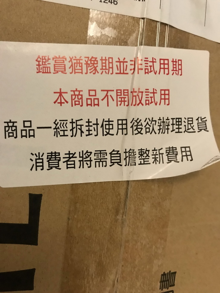 在這家買過幾次東西,好幾次都貼這標籤真的讓人覺得不舒服,不過想想也是啦,有些人沒事就亂買,買來和想像的不太一樣就退,這方面的成本都要業者自行吸收,業者也是很辛苦的啊!