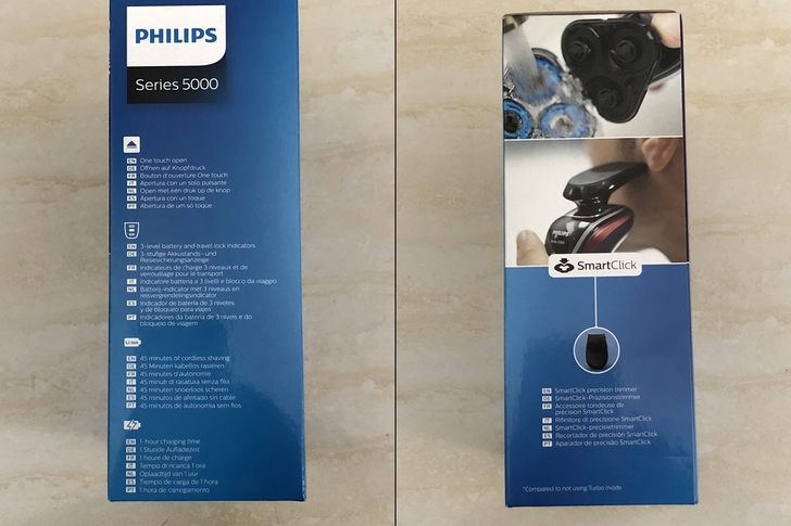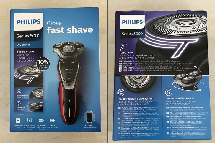 外盒的前後和側邊都有標示S5340的特色,包括5D FLEX刀頭,MultiPrecision 刀鋒系統,可水洗刀頭和快充等功能