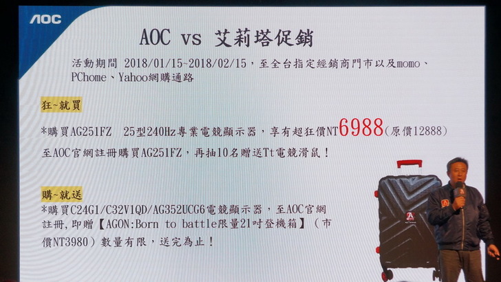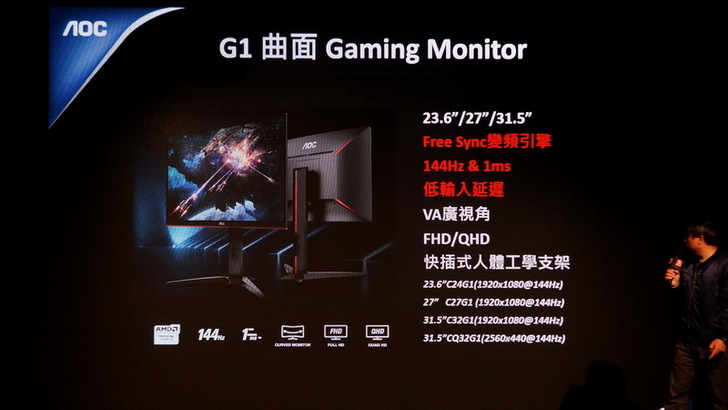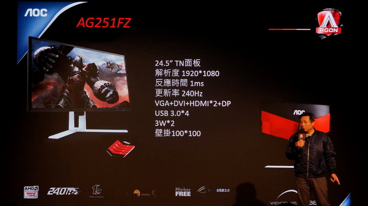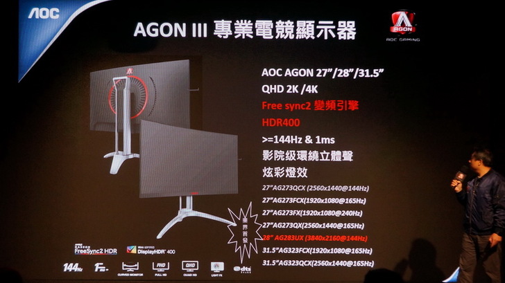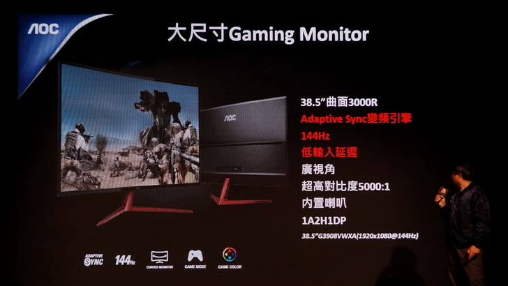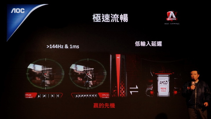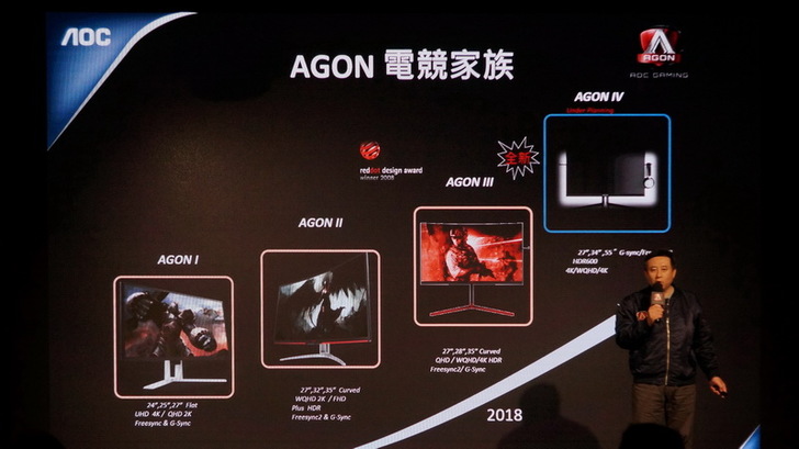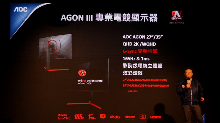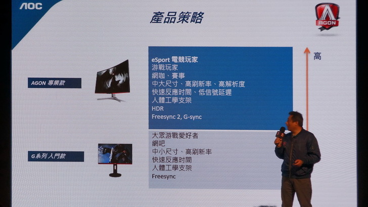 之前講了很多,但是真正了解AOC AGON專業電競顯示器的高手現在才上台,產品經理Jason為大家介紹AOC電競顯示器的產品線。我盡可能挑重點跟大家說明。