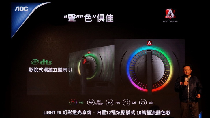 電競產品有個很特殊的現象,那就是一定要閃亮亮,AOC AGON系列專業電競顯示器也不例外,到了最新的AGON III,燈光的變化更是登上高峰。12種炫酷模式,10萬種流動色彩,另外再加上dts影院式環繞立體喇叭,夠酷夠炫。