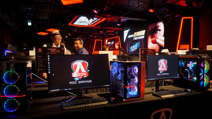 面對舞台的右側,擺了多台電競主機與電競顯示器的組合,本次發表的AOC電競顯示器都在這裡啦。老實說種類眾多,一時半刻很難一一介紹,但大致來說可以分為兩大系列,也就是AGON系列與G系列。AGON系列是AOC最高階專業的電競顯示器,G系列主打一般遊戲愛好者與網咖業者