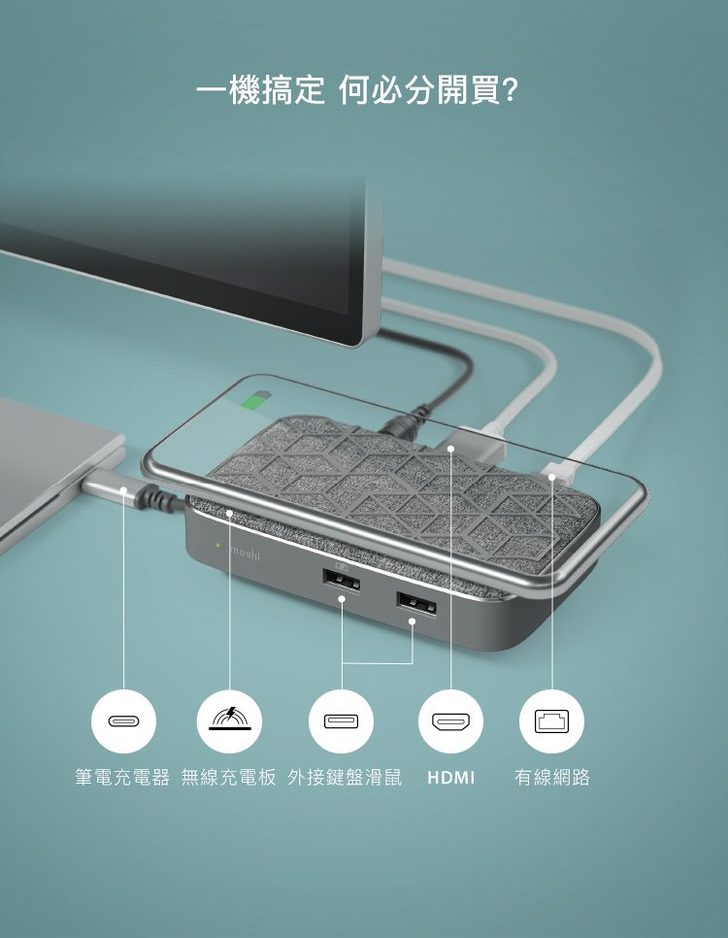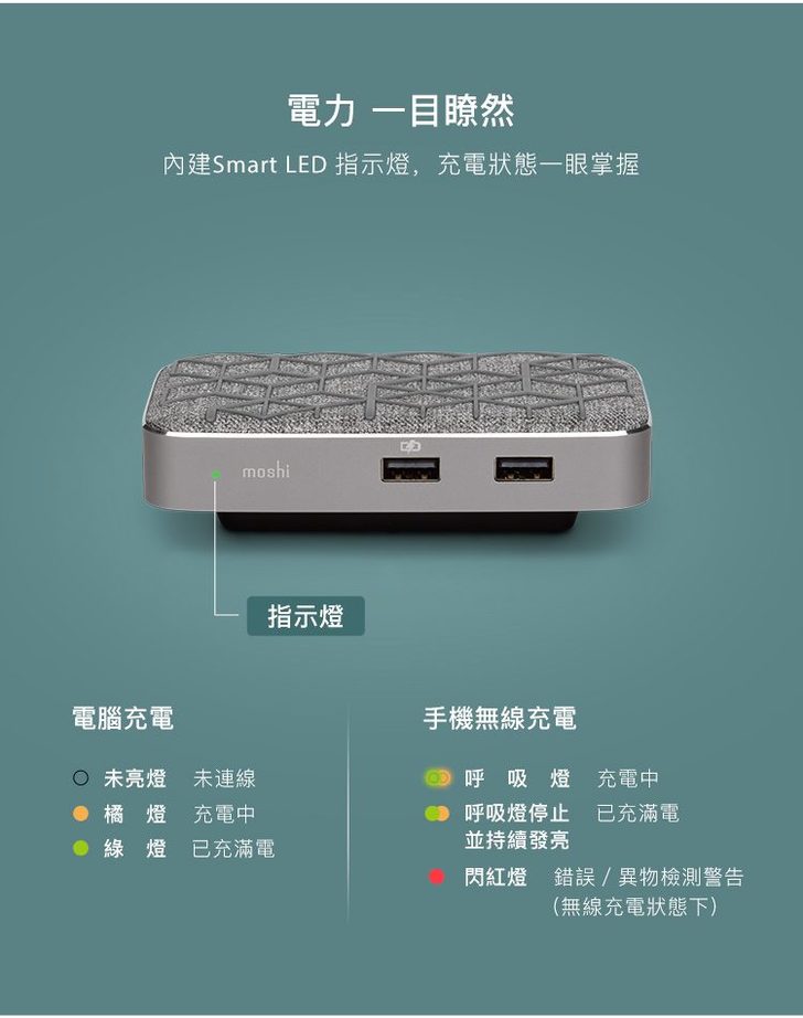 在Moshi Symbus Q 這台機器正上方的部分,是現在以及未來的趨勢,無線快充充電的面盤,他也是認證過的!