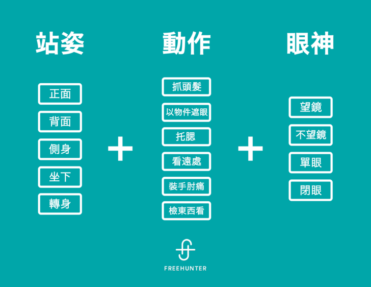 弄好了造型,就要在pose著手了。你以為在旅遊照片裡,名勝景點才是主角?非也非也。要記住,人才是最美麗的風景;只要你出現在照片裡,你就是唯一的主角。因此,你所擺的pose,是不能馬虎了事的。V字勝利手勢、大鵬展翅,這些俗套的姿勢都是遊客的代名詞,千萬個不要。構思 pose 其實就像買開心樂園餐:先挑主食,再選飲品,最後揀玩具。透過搭配眼神、站姿、動作的不同選項,就可衍生出千變萬化的組合(詳見下圖)。熟能生巧,多試幾遍,自然能找到一些自己感覺良好的 combination。