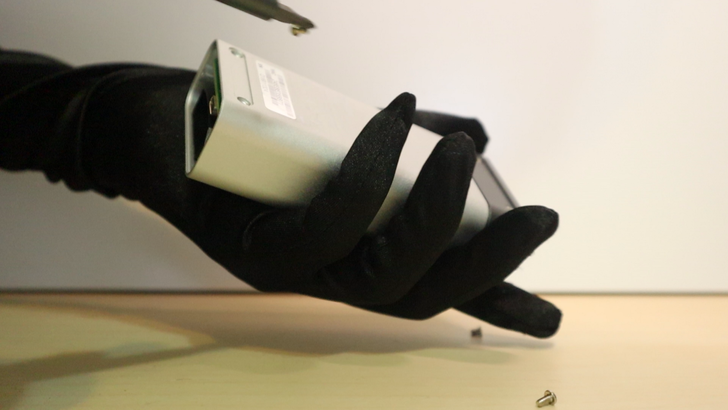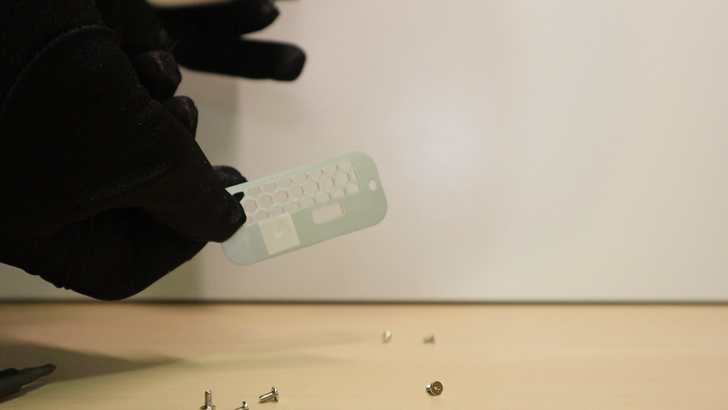 首先背面有兩個止滑條用雙面膠黏著的,需要先將其翻開。底部有四個螺絲。