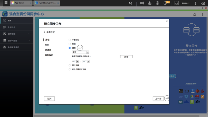 Enter 先設定「每天凌晨 2:00」讓 NAS 做上傳雲端的工作,設定完成後點選右下角「上一步」。