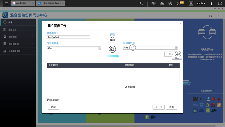 設定雲端的「目標資料夾」,設定在「NAS」這個資料夾中,然後點選右側「加入」,就會進入到下方的列表中,如下一個畫面所示。