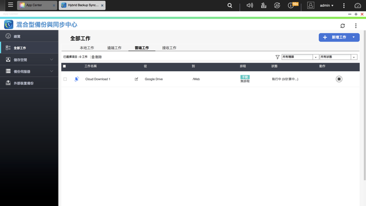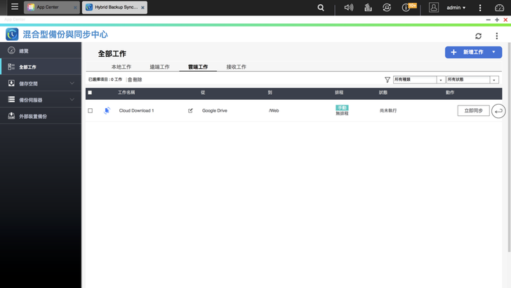 回到 Hybrid Backup Sync 的頁面,在「雲端工作」頁籤中的列表,已經可以看到我們剛才排程的工作。