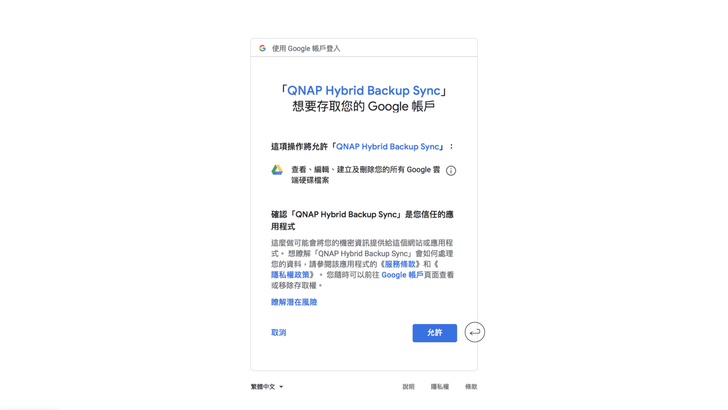點選「允許」,讓 QNAP Hybrid Backup Sync 能夠存取 Google 帳戶。包括「查看、編輯、建立、刪除」,這權限真的超大。點選後會回到原本的畫面。