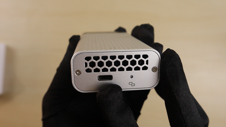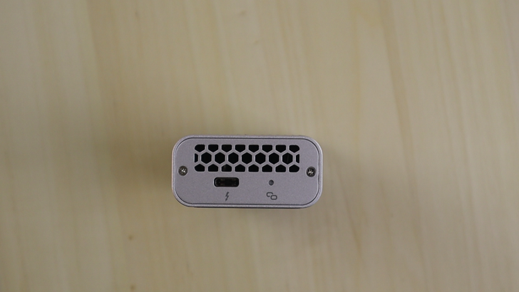 這面是 Thunderbolt 3 端的接口,右邊的指示燈在連接上時會亮藍燈。兩個螺絲鎖著一片鋁片,在鋁片上方的蜂巢狀簍空,是幫助散熱的出風口。