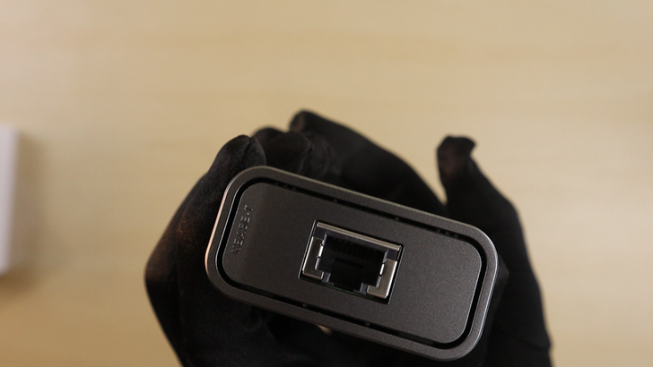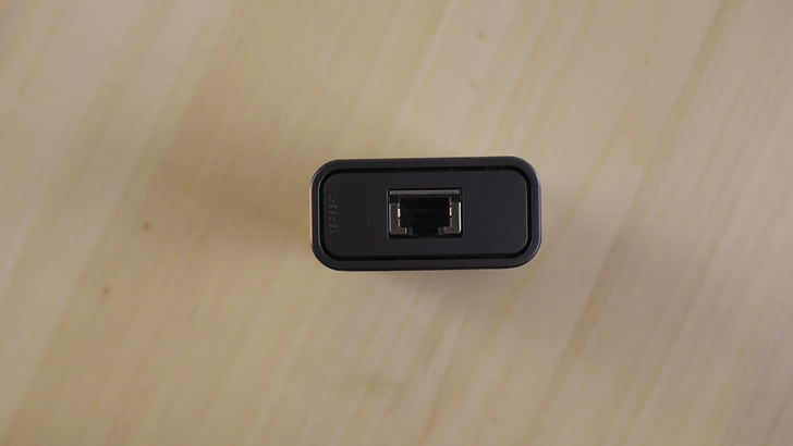 另一面是塑膠的材質,中間簡單就只有一個網路孔,上端有兩個 LED 燈,在連接成功後,右邊會恆亮綠燈。如果連接的網路是 GbE 或以下的,左邊會有黃燈閃爍。如果連接的網路是 GbE,左邊則會有綠燈閃爍。