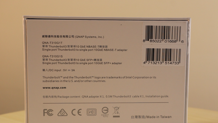 整個包裝是雙語介紹產品。在包裝盒背面,提到有兩個型號。手上這顆是 QNA-T310G1T,支援單阜五速的網路。5V 3A 換算 15W,看來耗電量與發熱應該不小。右下角有比較粗的字體強調台灣製造/Made in Taiwan。