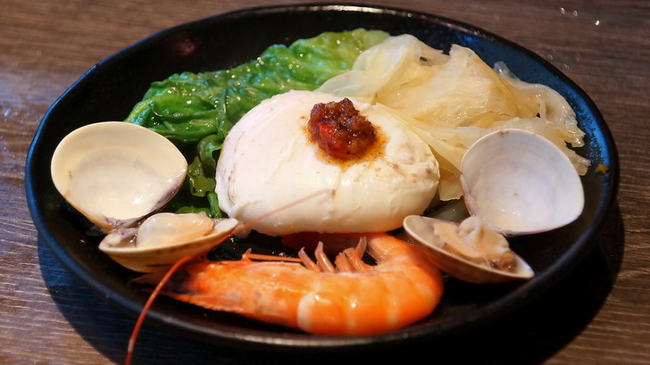 至於菜盤,種類也蠻豐富的,裡面居然還有一隻蝦與兩個蛤蜊。