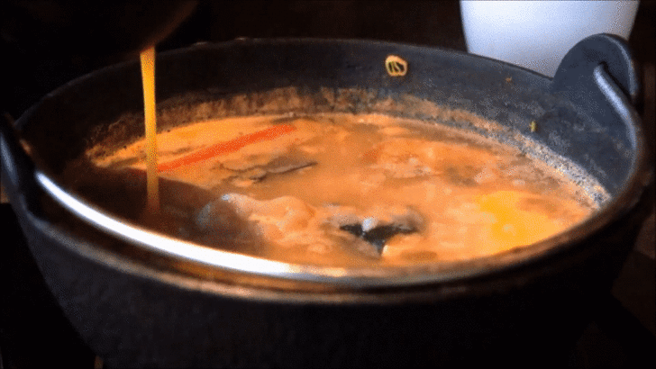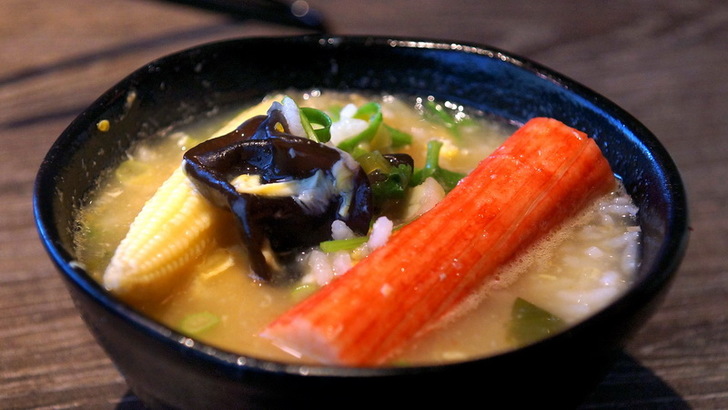 至於還有一顆蛋與還沒有吃的白飯,那又該如何料理呢?每次我看日本台,日本人吃完火鍋之後都會煮雜炊,這次在這麼日式的環境之下用餐,那就來煮雜炊吧。老媽那鍋湯充滿了山與海的精華,就用老媽那鍋湯來煮吧。先把米飯倒入鍋中,小火煮個幾分鐘。