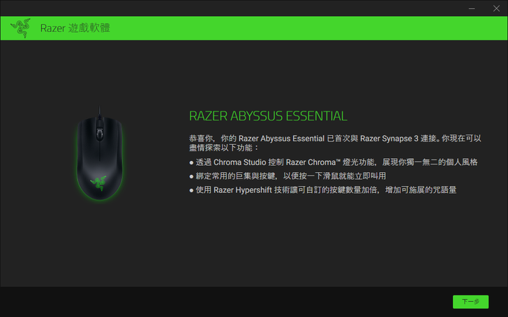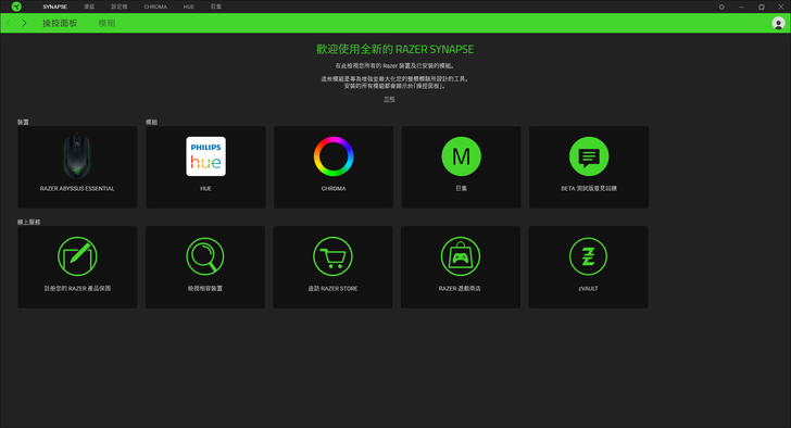 將 RAZER ABYSSUS ESSENTIAL 接到電腦平台上,就會自動帶出 RAZER 的軟體,不用上網額外進行下載安裝,但是要備妥或是註冊一組帳號才可以享用內部的功能。