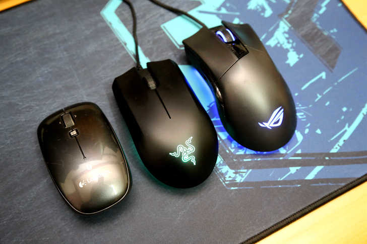 最後來講講手感心得,首先看到下面這張圖就是目前所持有的三隻滑鼠,由左至右分別為壞掉的 M557、本篇主角 RAZER ABYSSUS ESSENTIAL 以及 ROG Gladius II,一般日常生活工作使用還是以 ROG Gladius II,擁有 IE 3.0 的握感,以及好用的側鍵,對於瀏覽網頁真的是方便不少,長時間握住使用也是偏舒服的,這也是為什麼 RAZER 煉獄奎蛇賣的好的原因之一,因為都是同樣的身形。