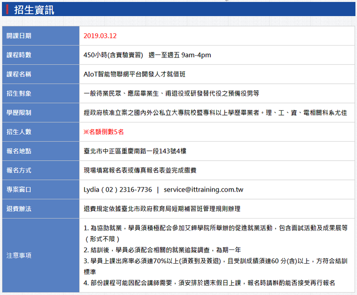 臺北市中正區重慶南路一段143號4樓 營業時間:9:00~21:00 │ 週三、六、日9:00~18:00 客服電話:(02)2316-7736 客服信箱:service@ittraining.com.tw 讚 收藏 快速回應 引言回應