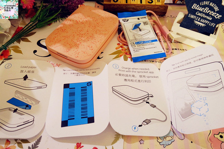 ♡基本配備非常簡單,就一台HP Sprocket口袋相印機主機以及一包相印紙,還有USB充電線跟說明書,如此簡單的配備也讓人覺得這果然是一台非常好上手的機器。