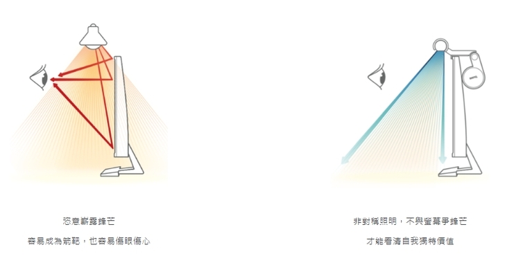 ▲為何要設計成掛燈型式,最大的重點就是非對稱的光學設計,不會反光,只照桌面不照螢幕,螢幕0反光,在有足夠亮度外,更能保護眼睛。