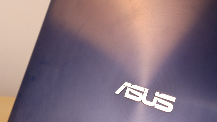 背面是同心圓髮絲紋與 ASUS Logo。這次有兩個顏色:皇家藍、冰柱銀。這款是皇家藍,在光源足夠下會有很多深藍色紋理,在陰影下看起來會變得非常深,接近黑色。
