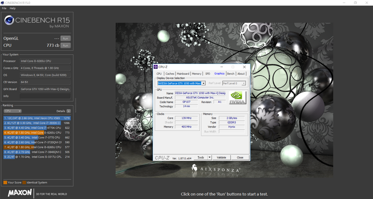 在插著電源情況下,以 Cinebench R15 跑分,在 CPU 方面跑出 773 cb 的高分。通常八代筆電處理器常會受限於散熱壓不下來,導致時脈無法長時間全開,而影響跑分。所以在畫面中左側 Ranking 可以看到同樣是 i5–8265U 這顆 1.8GHz,一般是 577 cb 的分數,UX533 跑到 733 cb,大約直接多了 30% 的效能,可見散熱在 UX533 得到很好的改善。