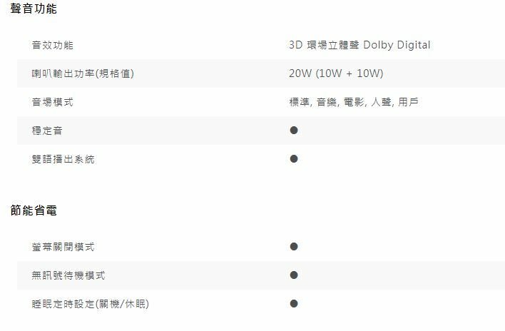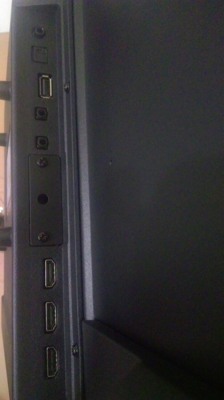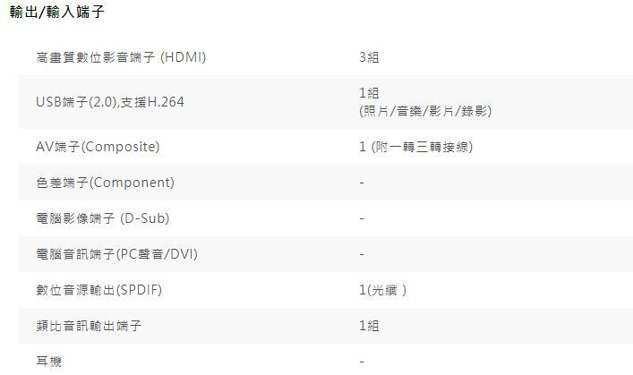 可以看到有 高畫質數位影音端子 (HDMI) x 3組、USB端子(2.0) x 1組、AV端子x 1組、數位音源輸出(SPDIF) x 1組、類比音訊輸出端子 x 1組,基本上該有的連接插孔,只是只有附送一條AV影音端子線材,有點殘念! 而顯示器本身也沒有Cable或是網路的接頭,所以必須要外接電視盒/多媒體播放器,如MOD、便當等等才能收看電視或影音節目,這應該還算符合目前電視設計及使用的潮流方向。