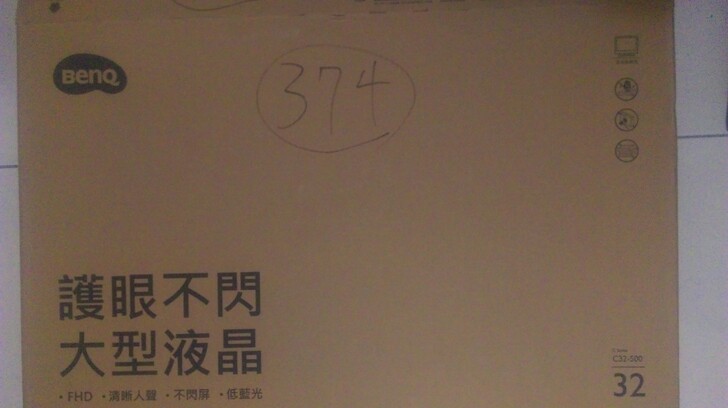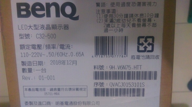 再來,看一下外箱標籤,確認產品是「BenQ LED大型液晶顯示器 型號:C32-500」,是2018年12月製造的新品無誤。