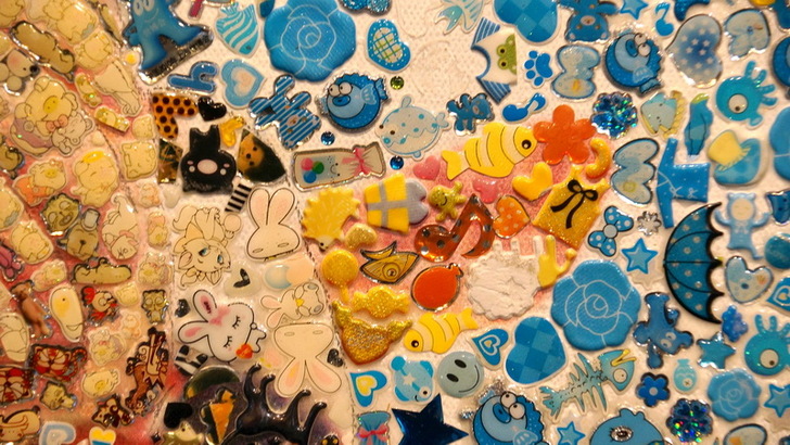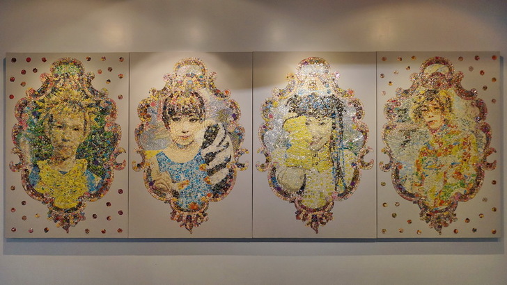 遠遠的看,是四位俊男美女的畫像,但是近看才發現了不起的地方。藝術家用小時候我們超常見的立體卡通貼紙,一塊一塊貼起來的啊。