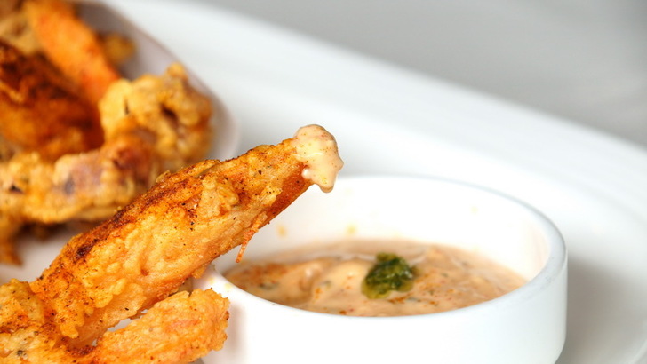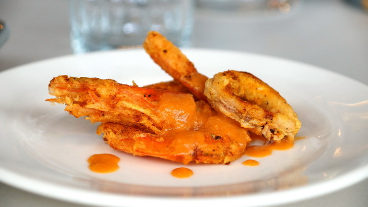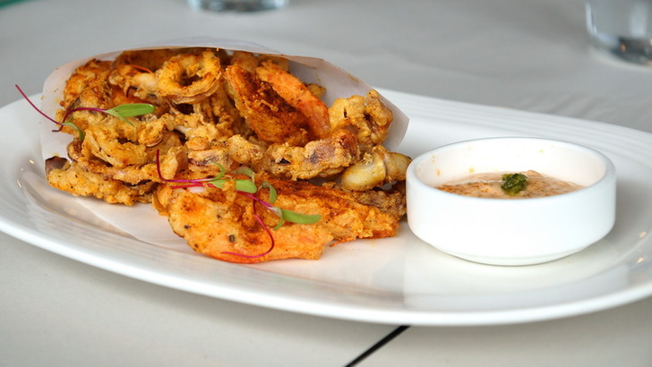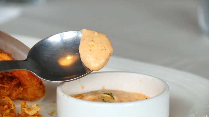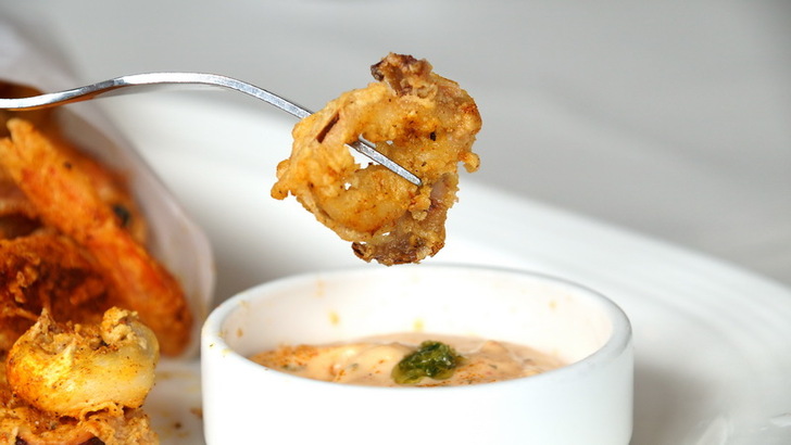 來了來了,餐點上桌了,首先是前菜,這道菜名叫「淺嚐威尼斯」,鮮蝦與小卷裹上麵粉去油炸,還附上蒜辣美乃滋。菜單上註明他們的麵粉使用杜蘭小麥粉,杜蘭小麥粉是製作義大利麵條的原料,因其澱粉含量低而蛋白質含量高,符合低GI值的飲食觀念。但是海鮮裹上杜蘭小麥粉油炸,這倒是第一次遇到。不過油炸物要熱吃,就先別管小麥品種了。