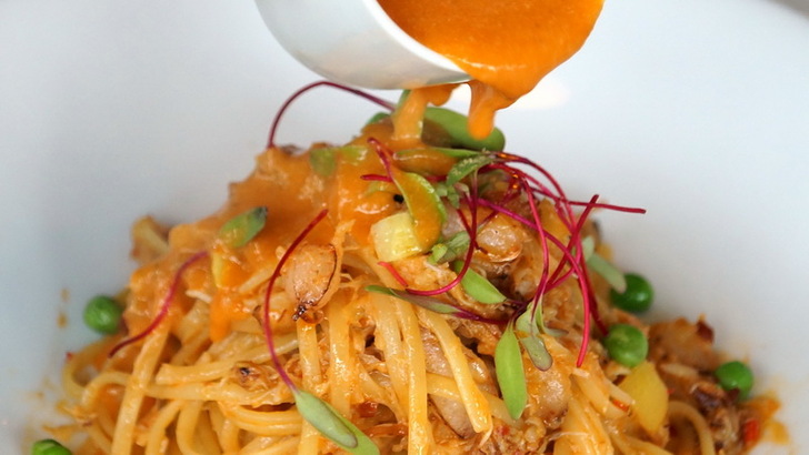 趕快拌一下讓濃湯充分裹附在所有的麵條上。