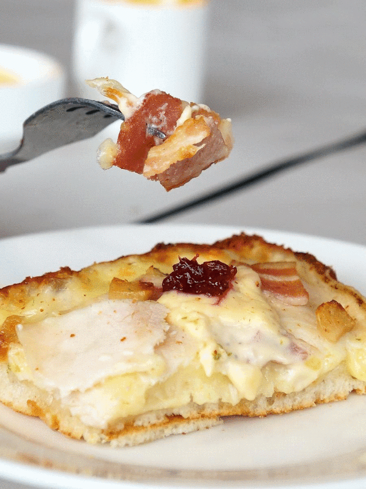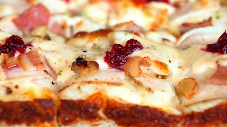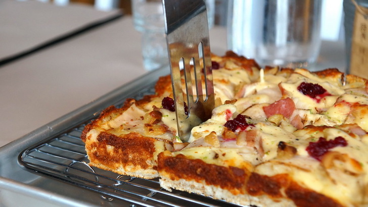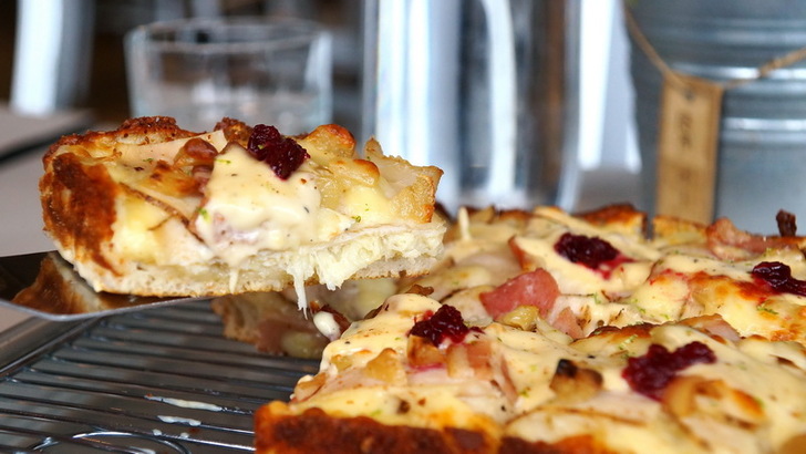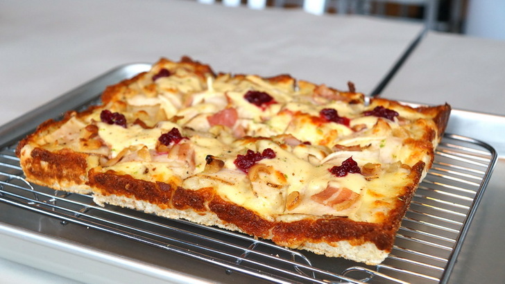 麵吃到一半的時候,其實披薩就已經送上桌了,我點的披薩名叫「天天感恩節」,說到感恩節,你會想到什麼?貪吃如我,當然想到吃火雞啦,是的,「天天感恩節」的餡料主角就是烤火雞肉片啦,再加上煙燻培根、酸甜蔓越莓、烤大蒜、綜合起士、搭配乳酪白醬組成,再以現磨肉豆蔻提味。