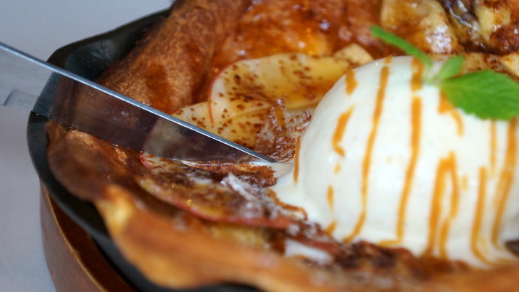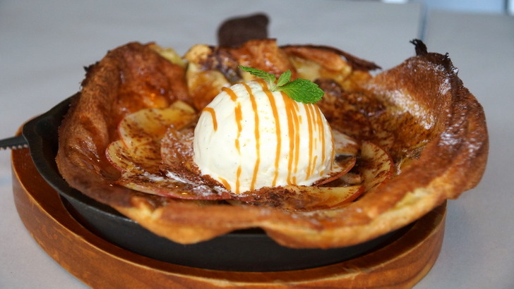 濃郁鬆軟的手工鬆餅搭配蘋果、肉桂、香草冰淇淋,佐焦糖醬