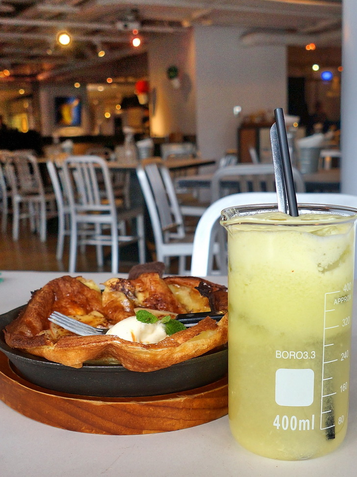 不過最後還是要回歸「吃吧」,因為鐵鍋鬆餅要上桌了(真是對不起服務人員,東奔西跑的找我),我點的是現烤焦糖蘋果鐵鍋鬆餅。