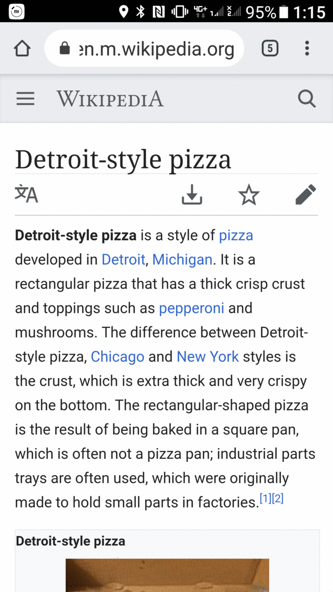 我有偷偷查了一下網路,維基百科英文版真的有Detroit-style pizza耶,我真是鄉巴佬啊。想想也不意外啦,雖然披薩是義大利食物,但美國則是披薩的第二故鄉,所以底特律人弄出一些特別的披薩也很合理啦。底特律方形比薩與其他披薩的區別在於餅皮,首先餅皮底部特別厚實且非常脆,餅皮邊緣感覺還略有香酥餅乾的感覺。此外,方形披薩是在方形烤盤中烘烤的結果,一般來說方形烤盤通常不是普通的烤盤,而是使用工業零件托盤,嗯….真的很有汽車之城的氣魄。