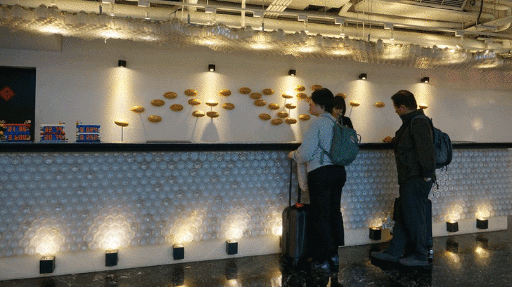 這裡的櫃台燈光是利用空的塑膠瓶作為間接照明,服務人員跟我說總共有2012個塑膠瓶,象徵酒店是在2012年開幕的。然後最有趣的是這個樂高積木拼出來的匯率換算表,之前還沒有見過這樣的設計。