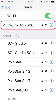 D-Link裝置的預設WiFi帳號與密碼,接著手機連線至新的WiFi帳號與自己設定的新密碼。不一會兒連線囉!順道測試一下網路上傳下載的速率吧~沒想到我的老 iPhone 5 竟也能跑出還可以的速度,想必這應該是DIR-2680 各項特異功能的加持吧!前一分鐘連線 300n 的 SSID 只有跑出 27.57 / 25.74 下載 / 上傳的速度,連上DIR-2680(SSID: D-Link