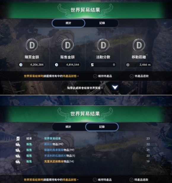 記錄:可以確認貿易中的購買/販賣紀錄、參加的各種活動記錄