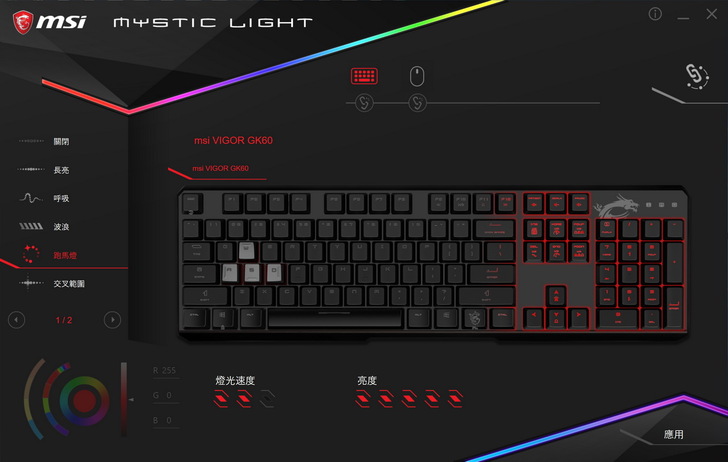 雖然GK60鍵盤上可用硬體熱鍵直接設定發光亮度、模式等,但直覺式的軟體MSI MysticLight可以調整鍵盤的發光亮度、且有多種發光模式可供選擇,依模式不同亦可設定發光速度,相當好用