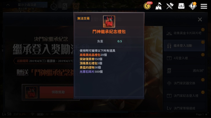 此外每次有角色上的變動或改變,都會有好康的獎勵,這次登入後即可領取鬥神繼承紀念禮包,內含許多物品幫助成長。