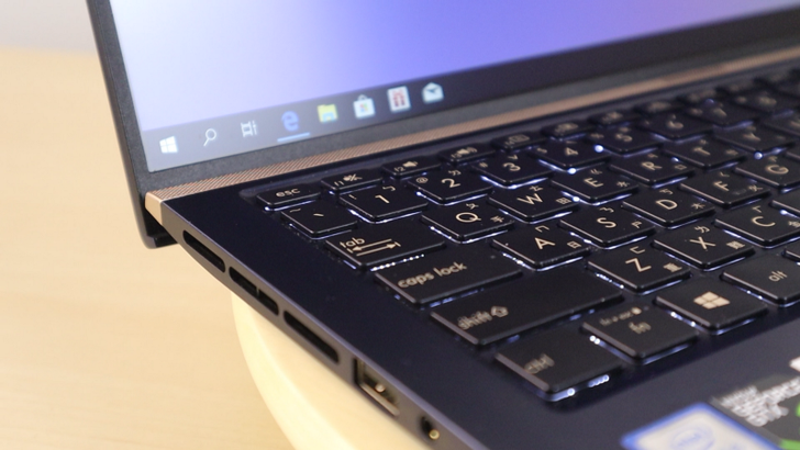 這次的 ZenBook UX533 有皇家藍跟冰柱銀,這款是皇家藍。在A蓋上是金屬的同心圓髮絲紋,在光線照射下反射細緻紋理,是華碩 ZenBook 的經典設計。