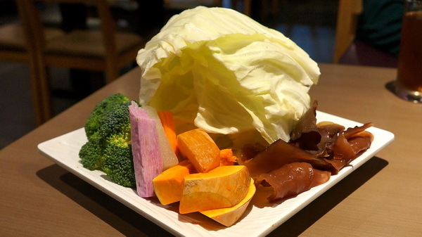 季節時蔬拼盤一份內有高麗菜,青花菜,南瓜,黑木耳,山藥與蘿蔔。