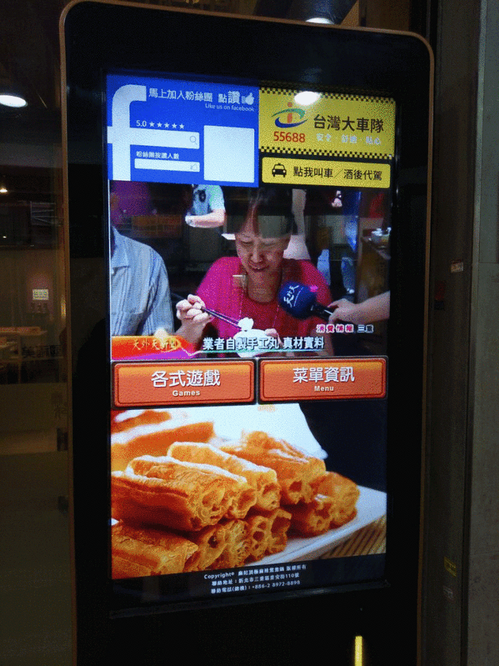 這次來麻妃,我並沒有急著進店門,我被門口的一台多功能顯示器所吸引了,這台顯示器可以幫你叫計程車,有菜單資訊,還有小遊戲可以玩。