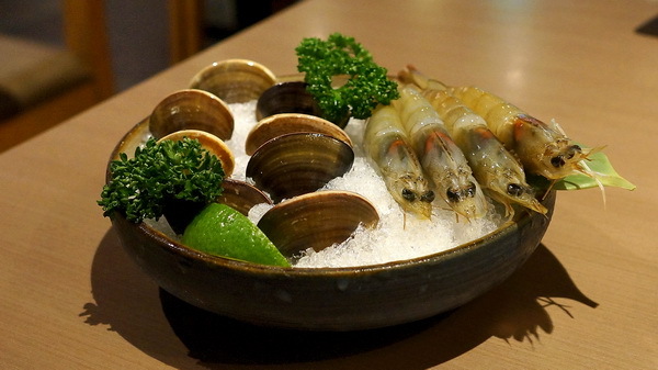 八個蛤蠣與四隻白蝦組成的雙重奏。