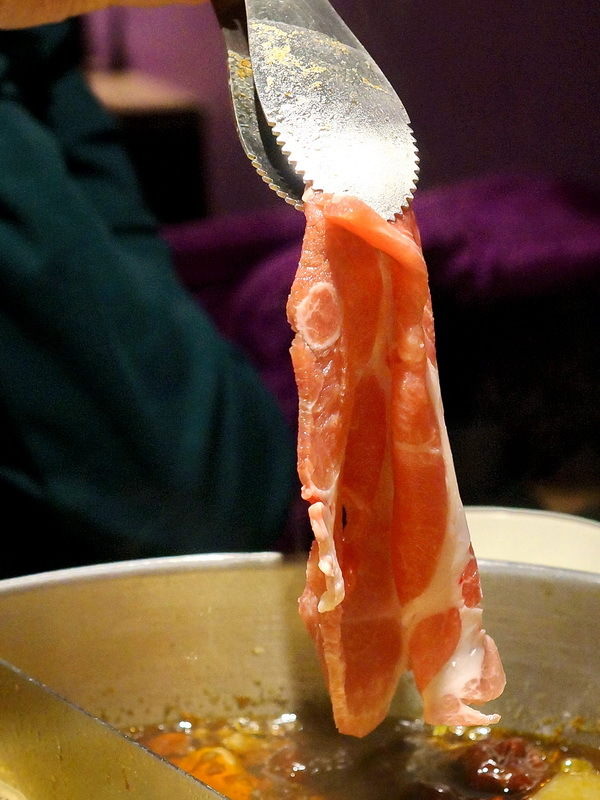 剛剛的海鮮我放在酸菜白肉鍋裡煮,至於肉類,我就放在麻辣鍋這裡煮啦,這次的肉盤有15oz,肉片切起來也蠻厚實的,老闆又跑來跟我說他們的肉類都來自美福,所以肉的品質都很好。事實上真的不錯,如果你去吃便宜的小火鍋,煮過肉的火鍋都會有很多的泡沫浮渣之類的,但是在這裡,煮過肉之後麻辣鍋泡沫浮渣很少,不用撈泡沫浮渣。