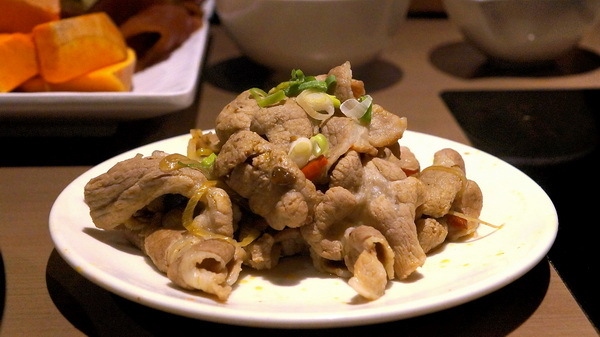 一次涮了不少豬肉片,灑點蔥花就很好吃,在麻辣鍋裡涮過的肉片,一點都不辣,充滿了各種香料的香氣,直接吃就很好吃。豬肉的油脂算是中間偏少,但是吃起來有點咬勁但毫不乾澀。