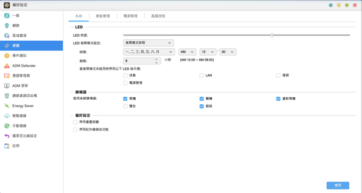 很特別的是,在「設定」》「硬體」》「系統」》「LED」,可以調整 LED 亮度。此外還可以設定 LED 的夜間模式,甚至指定夜間模式未啟用時要亮、要暗哪些燈。我覺得這個功能很不錯,如果 NAS 是放在房間,晚上睡覺又一定要全暗才能睡的人,有了這個貼心的設計,在擺設上就有更多彈性。如果你剛好相反,想把這四顆當夜燈也行,反正 NAS 本來就是 24x7 在運轉。