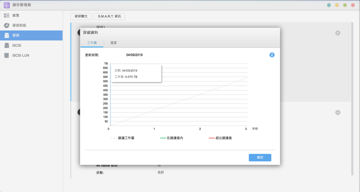 在詳細資料中可以看到個別硬碟的工作量,而以這顆三年保固來說,目前工作量是 6.675TB。而如下圖可看到 IronWolf 設計的工作量是 180TB/年。